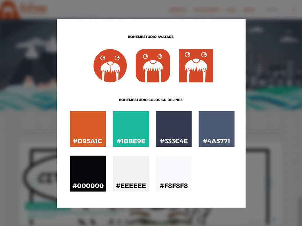 2014 - I designed a Wordpress theme from scratch for my personal portfolio at bohemestudio.com. This is a style guide with avatars, font families and colours.