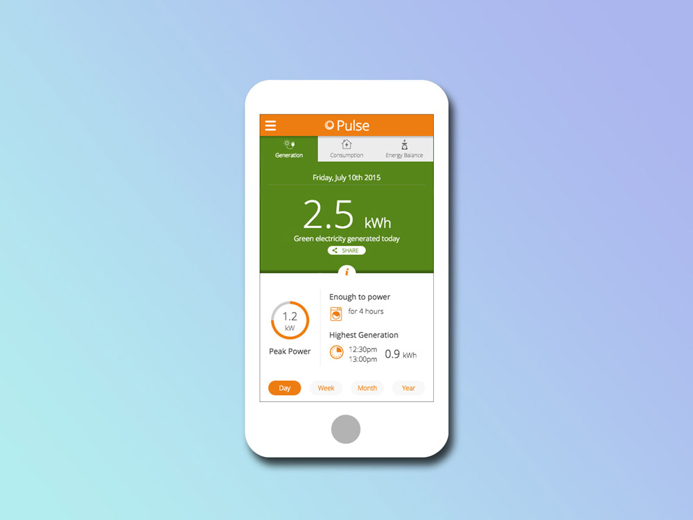 2015 - Pulse is a web app monitoring system for solar energy installations. This prototype displays information aimed at house owners with a solar installation. The app shows information about the generated and consumed energy.